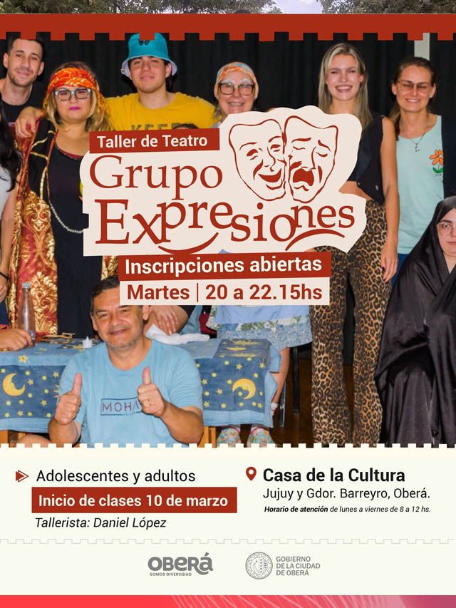 Por su parte, el Taller de Teatro “Grupo Expresiones” estará destinado a adolescentes y adultos, y se dictará los martes de 20 a 22.15 horas en la Casa de la Cultura, a cargo del profesor Daniel López, también desde el 10 de marzo.
