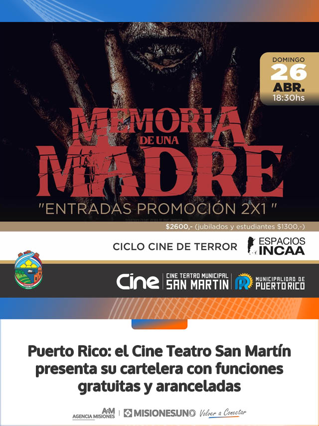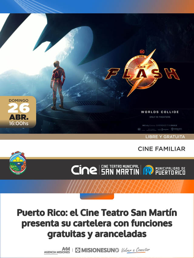 AGENCIA MISIONES.UNO | La Municipalidad de Puerto Rico dio a conocer la programación del Cine Teatro Municipal San Martín para el próximo domingo, con propuestas para toda la familia.